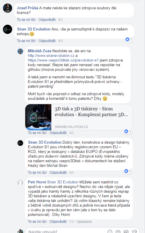 A ještě dodatek : "Dvouletý vývoj tiskárny a následně testování, je postaveno na knowhow firmy Siran 3D evolution s.r.o. a je opatřeno patentem"