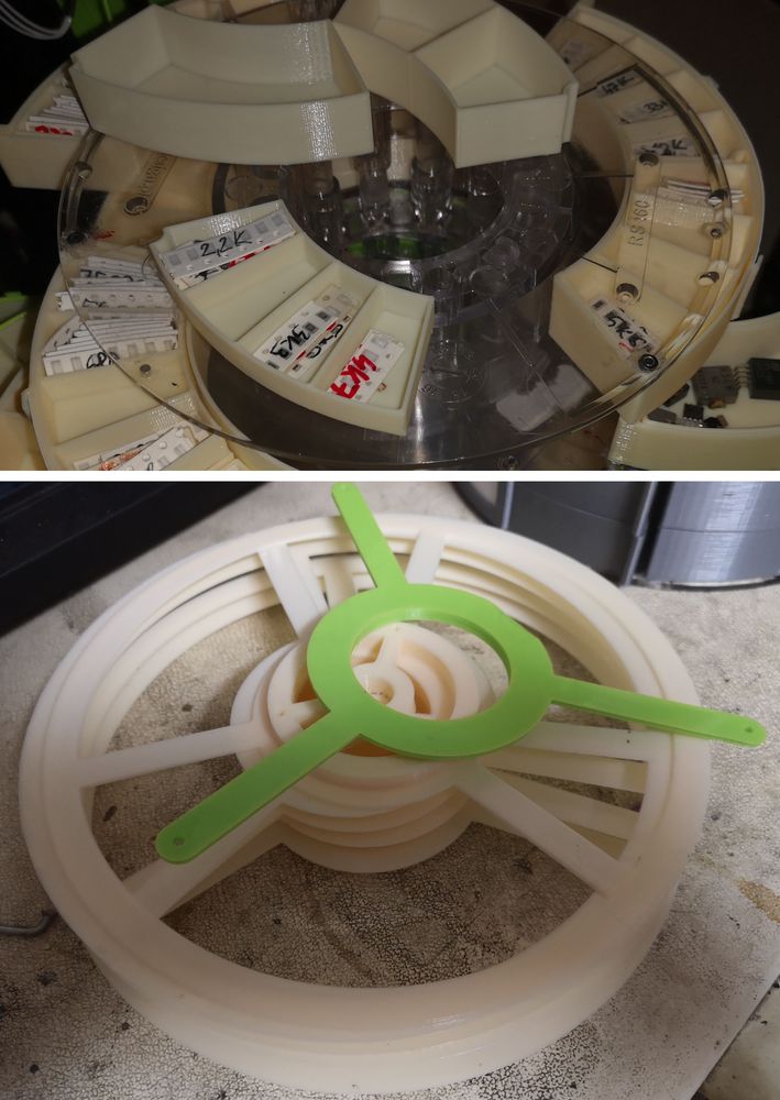 prepážky riešené ako vyberacie vložky, dole vystreďovacie krúžky pre ukladanie cievok na seba a šablóna na vŕtanie dier