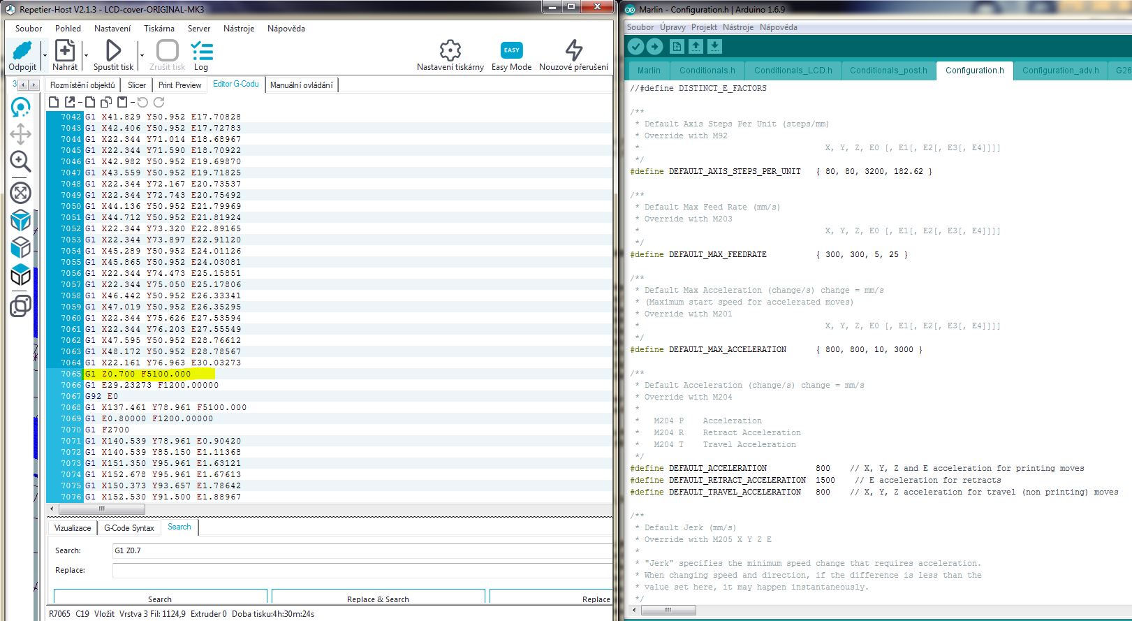 Tam mám to samé co ty. Na co jsem ovšem díky zkoumání holého G-kodu přišel že pokaždé když operuje s osou Z tak má rychlost F5100 - ovšem podle mě, když zvedá jenom o 0.2mm, tak to zvládne...(z kodu G29 jede pak z cca 6-10mm dolů) viz G-kod, kde tohle je postup na další vrstvu, pokud to tak chápu...