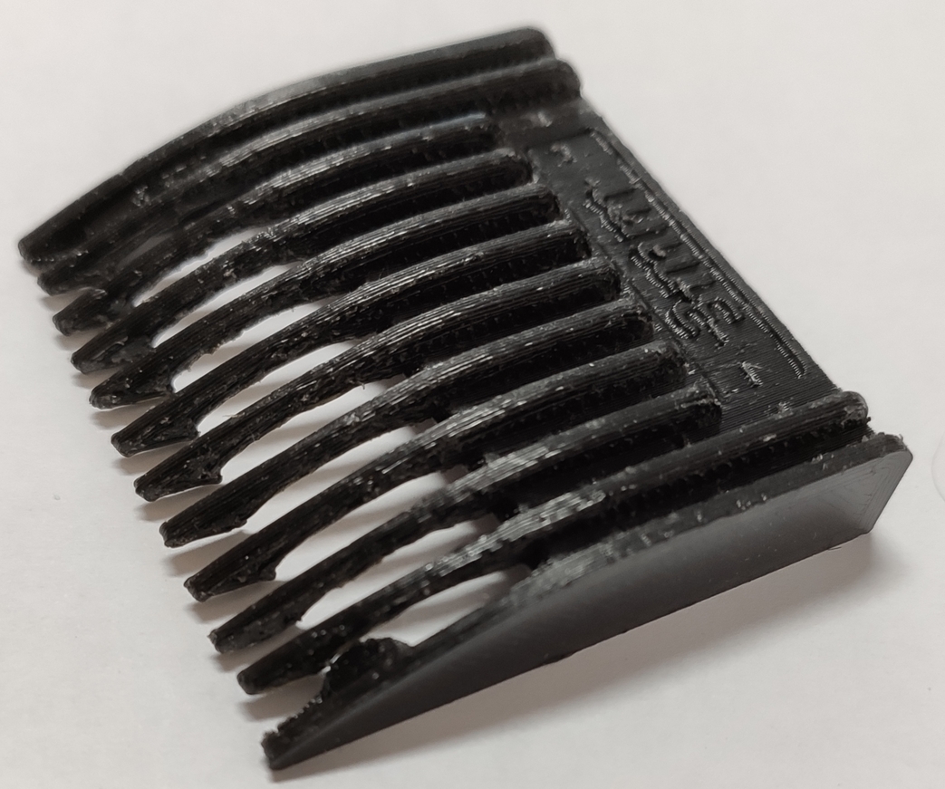 No po x-tom pokuse s roznymi nastaveniami a materialmi sa mi podarilo vytlacit nastavec na strihaci strojcek. Po hodine opatrneho odstranovania podpor je vysledok takyto