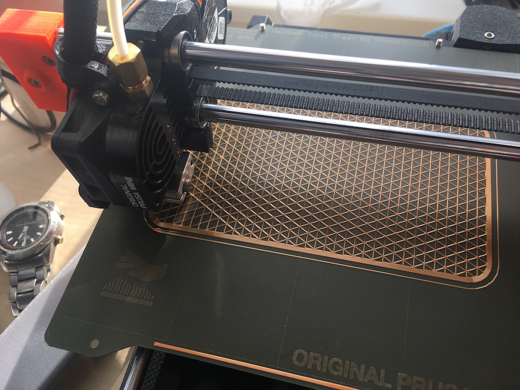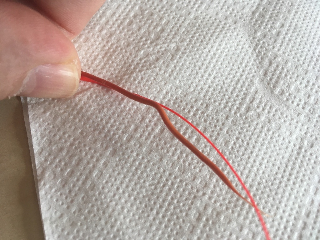 (červená je běžné PLA od PM a to tlusté je silk copper po průchody tryskou)