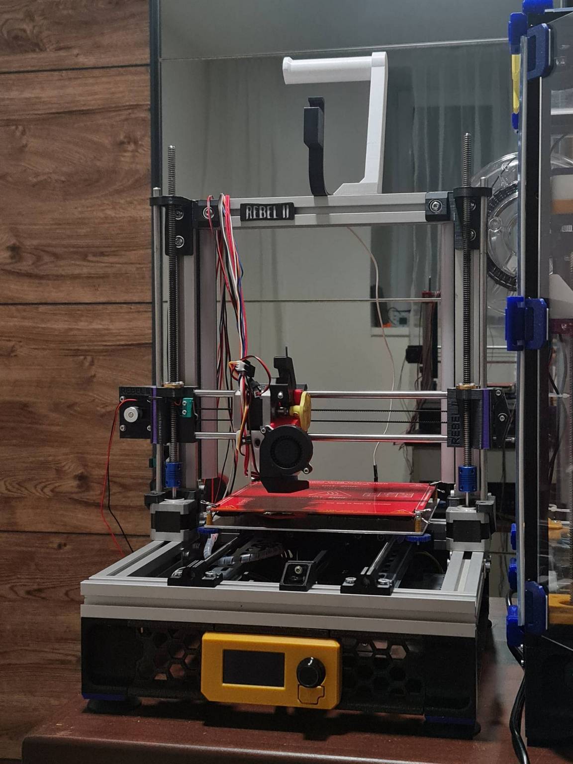 Děkuji za STLka a STPéčko. Já jsem tak moc jak to máte vy Rebela upravovat nechtěl. Jen v rozumných mezích modernizovat. Takže jsem celou X osu předělal na verzi R2V34, použil část držáku toolhedu, který jste zveřejnil a tak nějak ho napasoval na X vozík z V34. Všechno je ASA, jen ta bílá ozdoba je ABS.