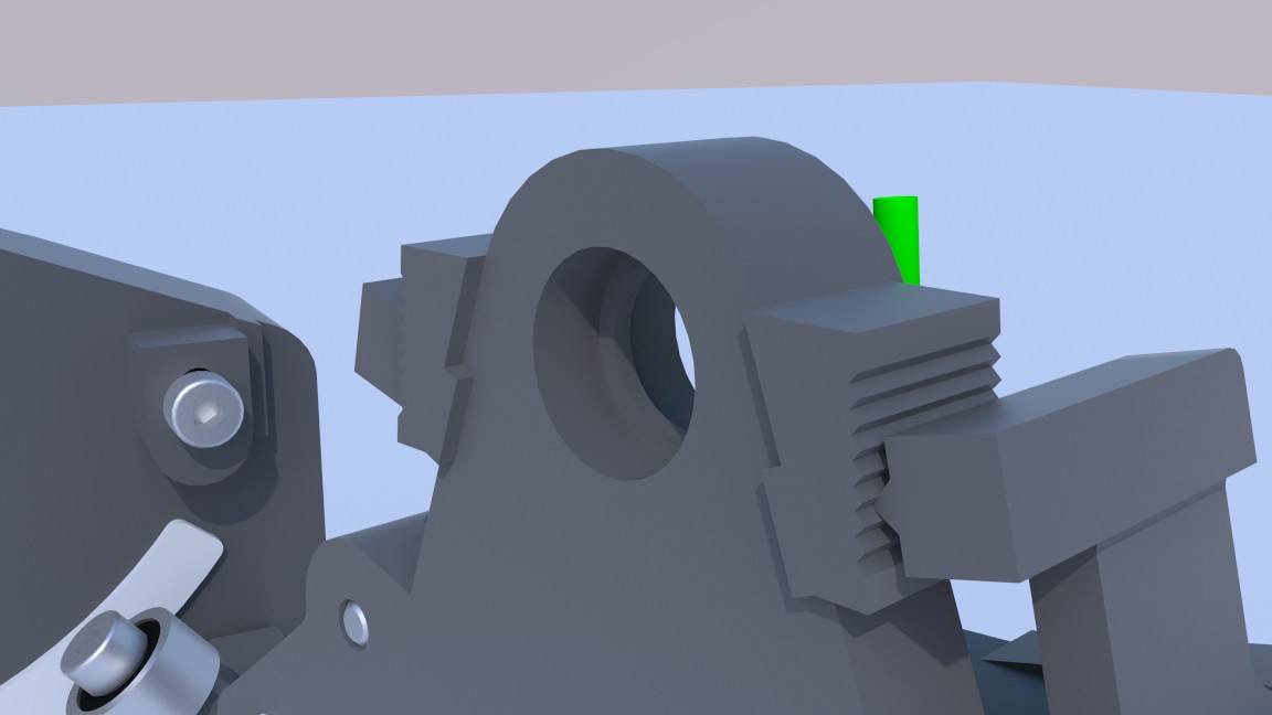 Tady je pohled na kontaktní místo mezi držákem a kolébkou. Jsou zde vidět kluzné vložky, které bych asi vyděl zhotovené buď z nylonu (možnost tištění) nebo z PTFE (teflonová deska a vystřihnout si je). Jsou v místě, kde jsou vymezovací ložiska.